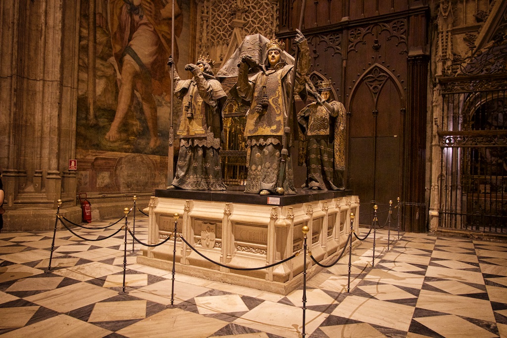 Spannend war für mich aber eine besondere Grabstätte. In dieser Kathedrale liegen die Gebeine von Christoph Columbus in einem sehr schön gestalteten Grab. Oder besser gesagt, hier liegen Teile der Gebeine von Columbus. Nach seinem Tod unternahmen seine Überreste eine kleine Weltreise, die in Sevilla begann und über Santa Domingo in der Dominikanischen Republik und Kuba wieder nach Sevilla führte. Überall war er mal begraben, wurde wieder exhumiert und reiste weiter. Dies hat dazu geführt, das gerade mal 150 Gramm von ihm am Ende in Sevilla ankamen. Wo der Rest abgeblieben ist, lässt sich wohl nicht mehr klären. Aber für nicht mal ein halbes Pfund Columbus hat man hier ein sehr prächtiges Grabmal hingestellt.